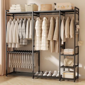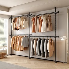 튼튼한 구조로 무거운 옷도 안정적으로 걸 수 있으며, 블랙 컬러와 심플한 디자인으로 다양한 공간에 어울리는 드레스룸용 옷걸이 행거이다.