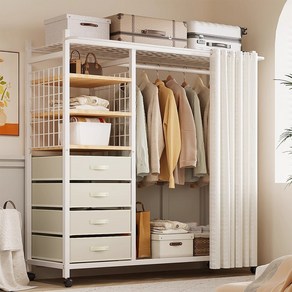 조립식 철제 프레임과 커튼이 포함되어 좁은 원룸이나 공간에서도 효율적으로 옷과 소품을 정리할 수 있는 이동식 시스템행거로, 깔끔한 흰색 디자인이 특징이다.