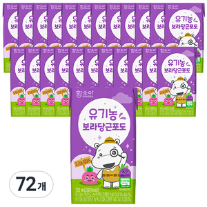 함소아 유기농 보라 당근 포도 주스는 125ml 용량으로 72개가 포장된 제품입니다. 유기농으로 만들어져 신선한 맛을 느낄 수 있으며, 보라 당근과 포도의 과일 풍미가 살아있습니다.