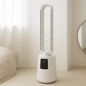 BLDC 모터와 저소음 설계로 조용하며 공기청정 필터가 탑재된 날개없는 타워형 선풍기로 공기순환에도 효과적임.