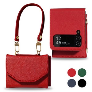 천연 소가죽 사피아노 소재로 제작된 Z플립 전용 카드 지갑 케이스이며, 어깨 스트랩과 손목 스트랩이 포함되어 편리한 휴대가 가능합니다.