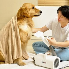 터치 한 번으로 작동하는 자동 에어탱크 방식의 반려동물용 드라이기로, 양손이 자유롭고 소음이 적어 강아지가 편안하게 건조됨.