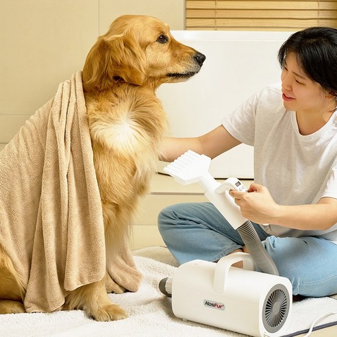 4단계 온도 조절이 가능한 고출력 드라이기로, 저소음 설계와 3종 노즐 구성으로 반려동물 건조가 편리함.