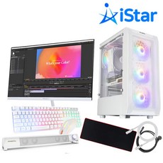 화이트 감성 디자인의 조립 게이밍PC로, 27인치 모니터와 인텔 6100 CPU, GTX 1050 그래픽, 8GB 메모리, 윈도우10 홈이 포함된 풀세트임.