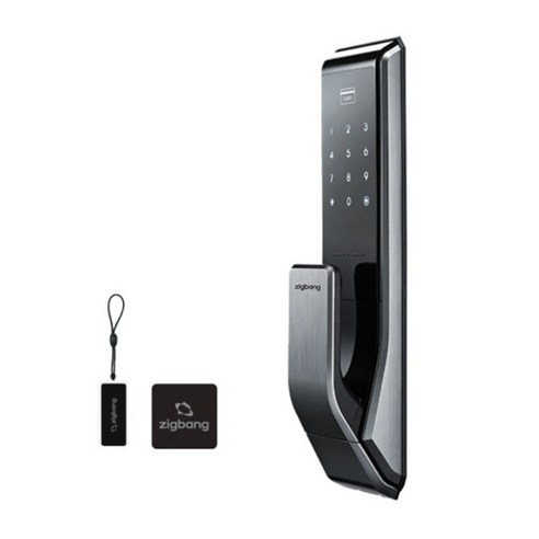 지문인식과 푸시풀 손잡이를 갖춘 도어락으로 카드키 4개가 포함되어 고객이 직접 설치할 수 있는 제품입니다.