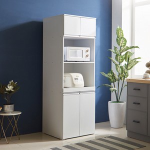 화이트 색상의 4단 주방수납장은 전자레인지, 밥솥, 정수기 등을 효율적으로 수납할 수 있도록 설계되어 공간 활용에 도움을 준다.