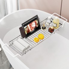304 스테인리스 재질로 제작된 길이 조절 가능 반신욕 트레이로 내구성이 뛰어나고 욕조 위에 편리하게 거치할 수 있다.
