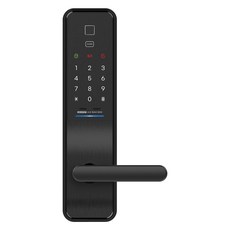 지문인식과 번호키, 카드키로 출입이 가능하며 무타공 방식으로 설치되는 손잡이 일체형 푸시풀 도어락.